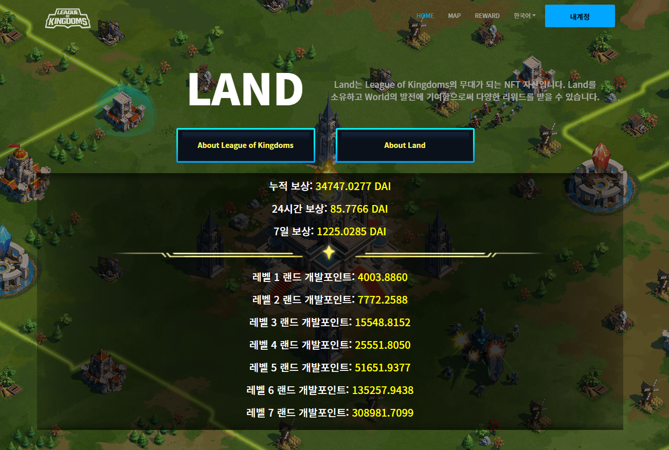 리그 오브 킹덤엔 보상 풀이 존재하여 게임 내에서 발생한 이익금은 풀에 적립이 되며 이렇게 쌓인 보상은 각 LADN의 레벨에 따라 차등 분배됩니다. 이때 보상되는 코인은 스테이블 코인 DAI로 지급이 되며 풀에 쌓인 보상금에 대해서는 아래 링크를 통하면 확인이 가능합니다.