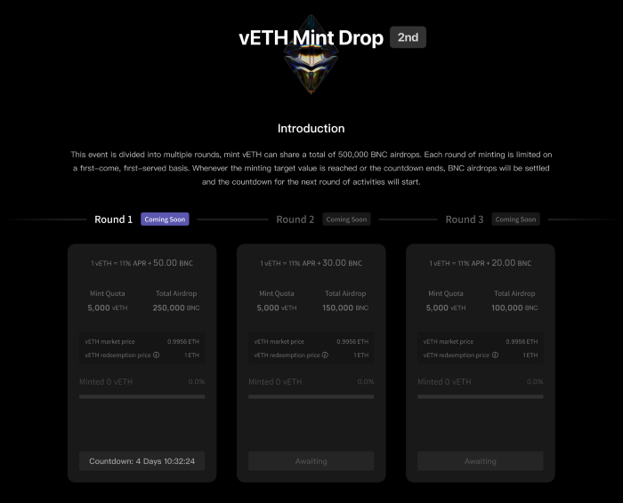 vETH는 이더리움의 1:1 파생상품이므로 하나의 ETH를 vETH로 발행하면 동일한 수량을 받게 됩니다. 해당 라운드 동안 지갑에서 vETH를 발행한 경우 지갑이 스냅샷에 포함되어 에어드랍을 받을 수 있습니다. 에어드랍은 해당 라운드에서 스냅샷을 찍을 때 지갑에 보유하고 있던 vETH 금액에 따라 BNC로 지급됩니다.