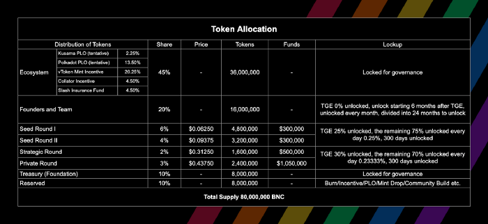 바이프로스트 파이낸스의 기본 토큰 BNC의 총공급량은 8천만 BNC이며 이 중 45% 는 생태계 인센티브에 사용됩니다. Parachain 슬롯 경매, vToken 채굴 인센티브를 포함합니다. 10%가 할당되었으며, 이 할당된 부분은 슬롯 경매, Mintdrop 및 기타 커뮤니티 이벤트를 위한 예산으로 사용됩니다. 예산 할당은 변경될 수 있으며 Parachain 슬롯 경매 전략에 따라 조정될 수 있습니다. 바이프로스트 파이낸스는 수백만 달러의 새로운 엔젤 파이낸싱을 받았으며 NGC, SNZ, DFG, PAKA, CMS Holding, Altonomy, LongHash Ventures 등과 같은 여러 주요 기관이 투자에 참여했습니다.