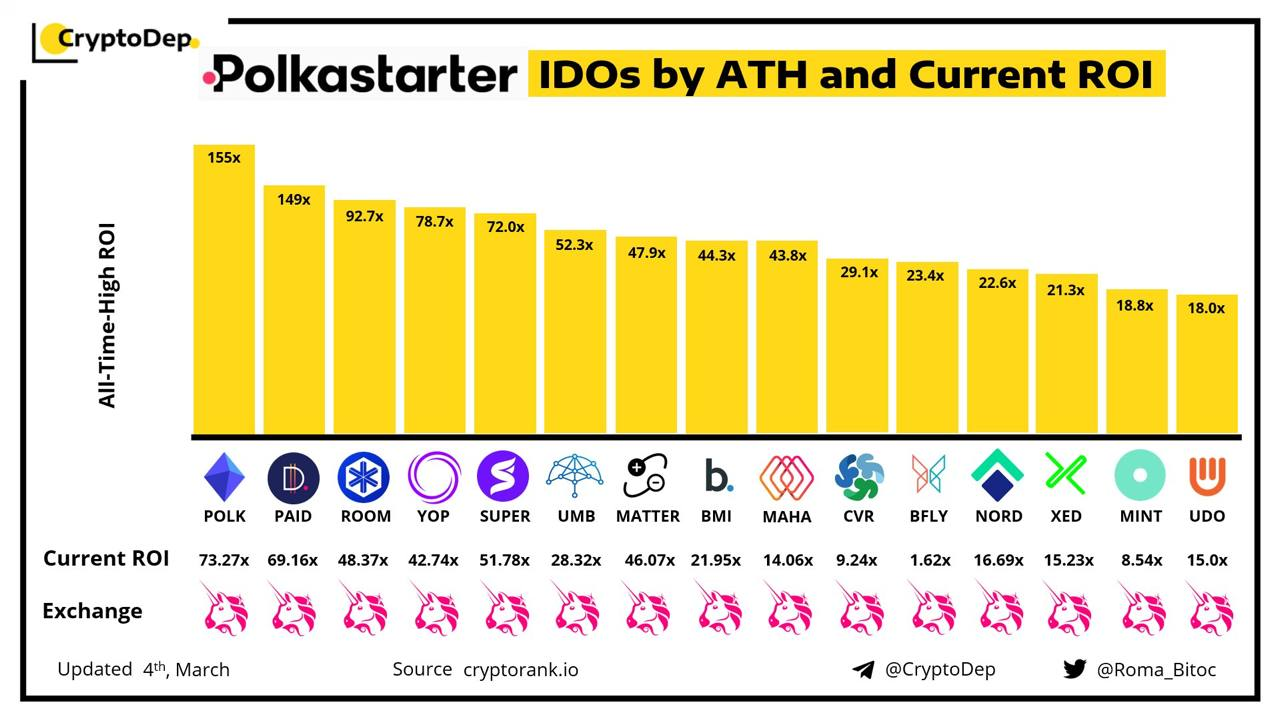 위 자료는 폴카스타터의 IDO를 진행하고 유니스왑에 상장된 프로젝트들의 상승률을 나타낸 자료이니 참고하시면 좋을 것 같습니다.