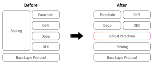 이러한 문제를 Bifrost는 스테이킹과 DeFi 간의 보상 경쟁을 기본 프로토콜을 기반으로 구축된 애플리케이션 레이어와 스테이킹 간의 관계를 병렬이 아닌 하향식 호환으로 변경하면서 문제를 해결하려 합니다.
