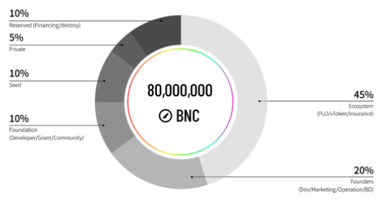 초기 총 공급량은 80,000,000 BNC이며 Seed, Private 세일만 진행되어 일반 투자자들이 락업이 없는 BNC 토큰을 구매하기는 어렵습니다.