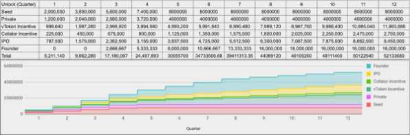 Seed와 Private의 락업 정책은 위 표에 나오듯이 5분기까지 분할로 배분됩니다.