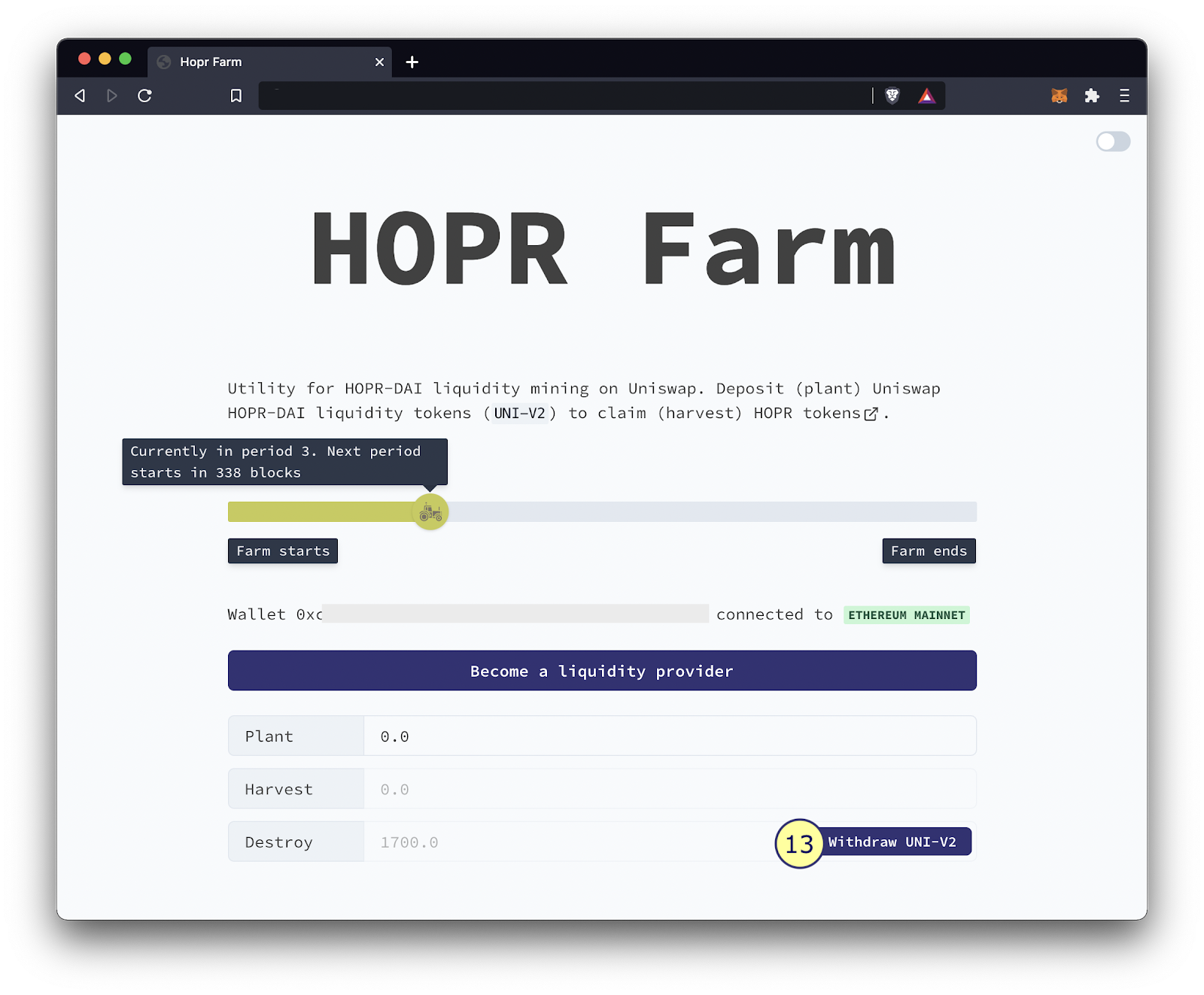 “Destroy” 단계를 시행하면 UNI-V2가 지갑으로 반환되지만, 유니스왑 풀에서 HOPR와 DAI의 유동성을 자동으로 제거해주지 않는다는 걸 알아둬야 합니다. 이 작업은 이용자가 직접 유니스왑 인터페이스를 통해 진행해야 합니다.