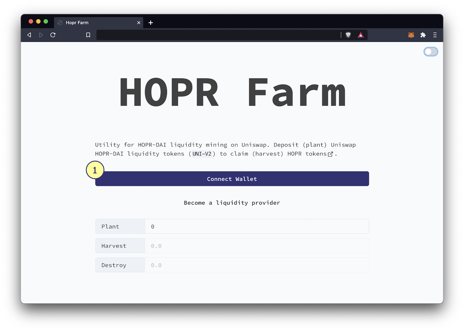 저희는 커뮤니티 멤버들이 파밍을 더욱 편리하게 할 수 있도록 유저 인터페이스를 제공합니다. 이용자는 MetaMask 지갑에 HOPR 토큰과 DAI 스테이블 코인이 모두 있어야 유동성을 제공할 수 있습니다.
