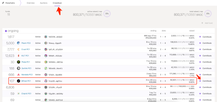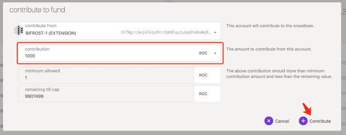 4 단계 : Bifrost PC1을 찾고 수신된 테스트 ROC 수를 입력 한 다음 슬롯 입찰 지원을 위해 Contribute를 클릭합니다.