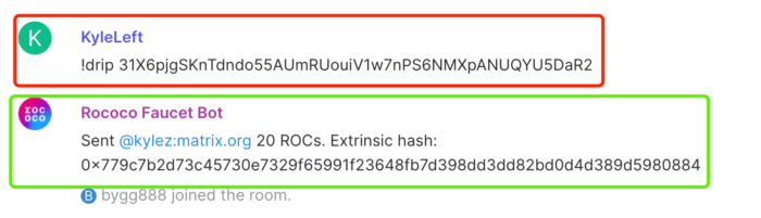 2 단계 : 채팅방에 !drip + Rococo address를 입력하여 봇을 통해 테스트 ROC를 얻습니다.