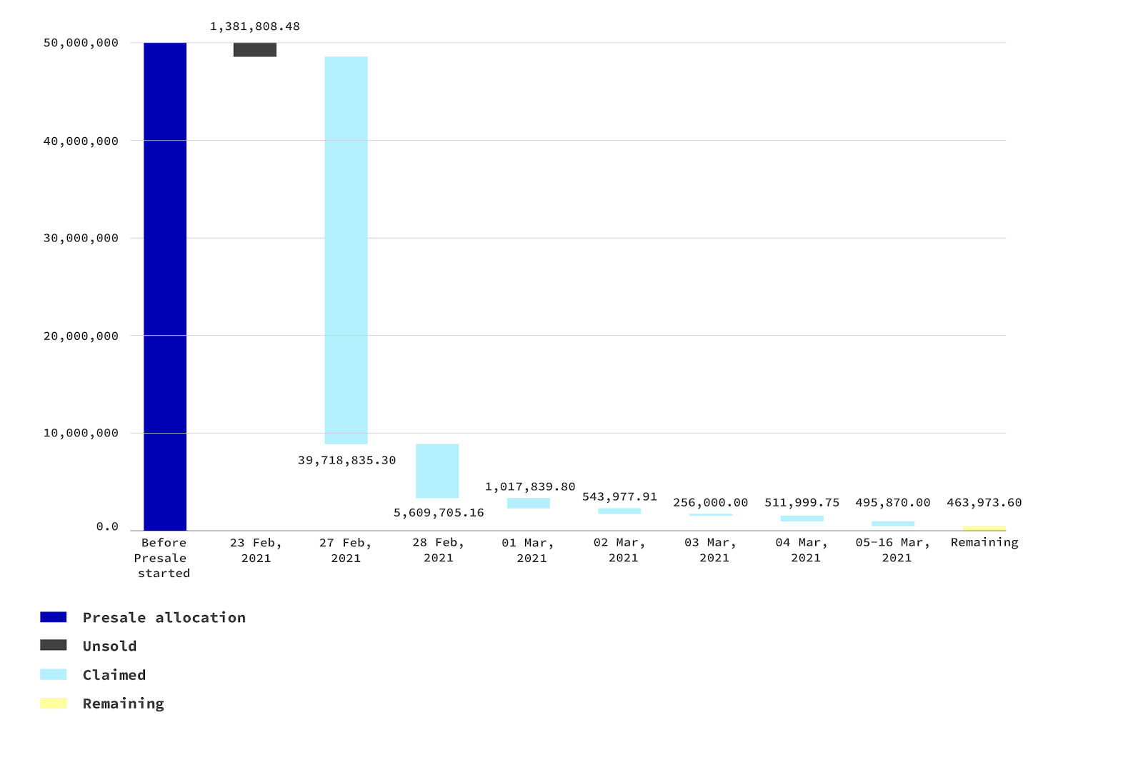 총 5천만 개의 HOPR 토큰을 프리세일에서 구매할 수 있었습니다. 프리세일 종료(2월 23일) 당시, 단 138만 개의 토큰만이 재고로 남았습니다. 이 잔량은 전부 DAO에 의해 이더리움 메인넷에 다시 연결되어 LBP에 초기 유동성을 더했습니다.