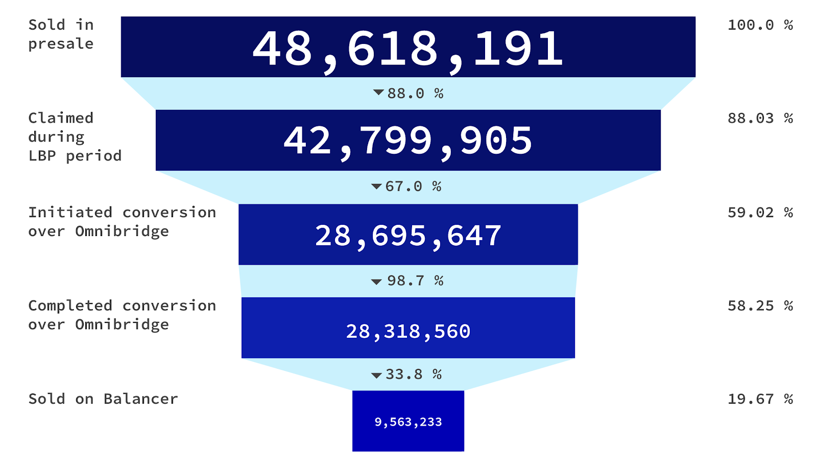 옵션 1은 LBP의 마지막 단계에서 가격 하락의 원인이 되었습니다. 옴니 브리지(Omnibridge)의 데이터를 이용해 얼마나 많은 프리세일 토큰이 이 경우가 되었는지 알 수 있습니다.