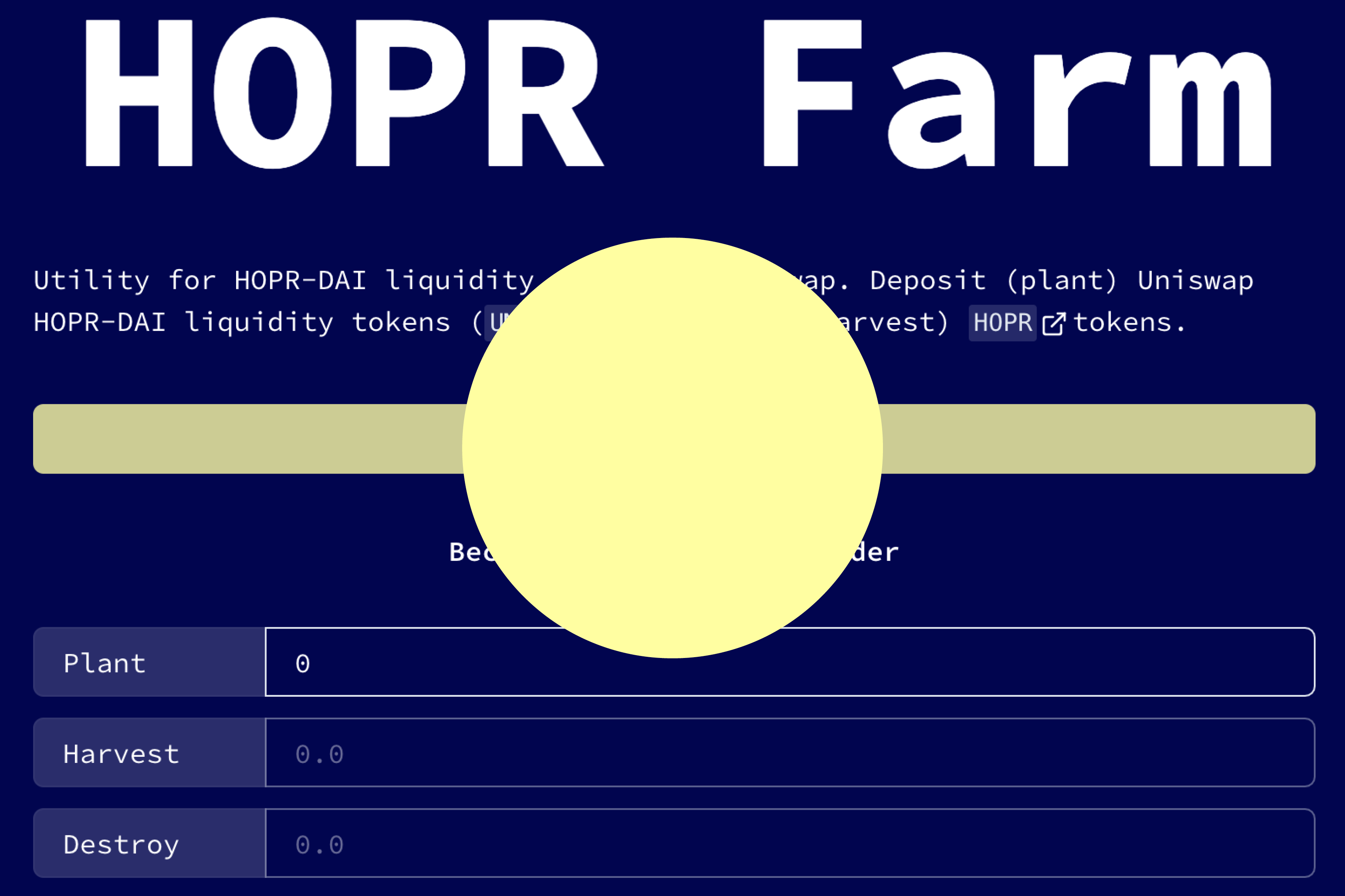 저희는 이미 지난 게시물을 통해 유동성을 공급하고 파밍을 시작하는 방법에 대한 개요를 제공해 드렸습니다. 원하실 경우, 전체 과정을 1분 안에 보여주는 영상을 여기에서 확인하실 수 있습니다. HOPR Farm 인터페이스는 https://hopr-farm.eth.link/ 에서 찾아보실 수 있습니다.