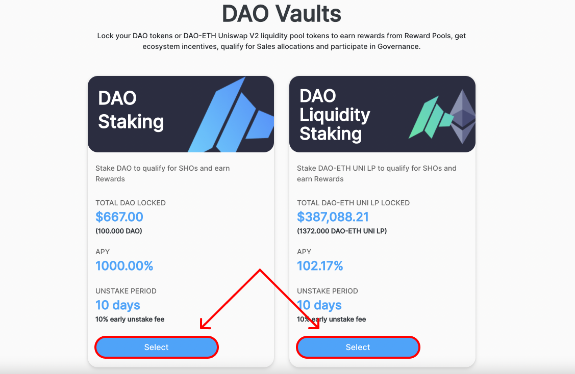 DAO를 스테이킹하고 DAO Power를 얻어 원래처럼 DAO Vaults로 이동하여 DAO 또는 LP DAO를 스테이킹 하기 위해서는 다음과 같이 하십시오.