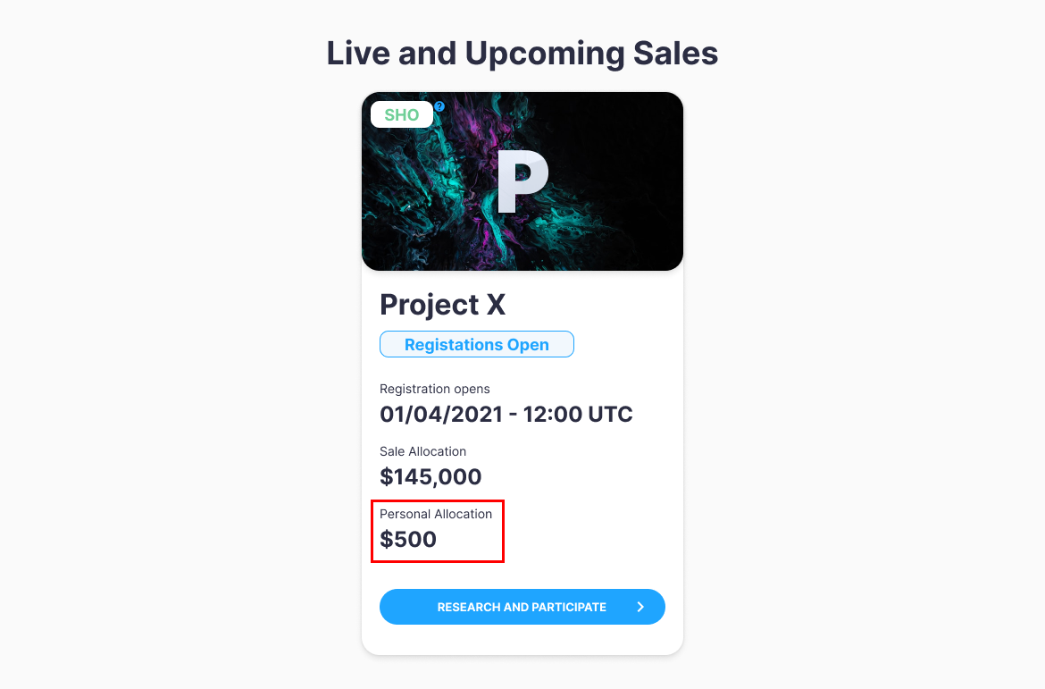 메인 페이지에서 각 프로젝트 세일에 할당해야 하는 금액을 확인하십시오. 할당 금액이 500 USDC인 경우, 이 세일에 참여하기 위해서는 최소 500 USDC의 선입금이 필요합니다.