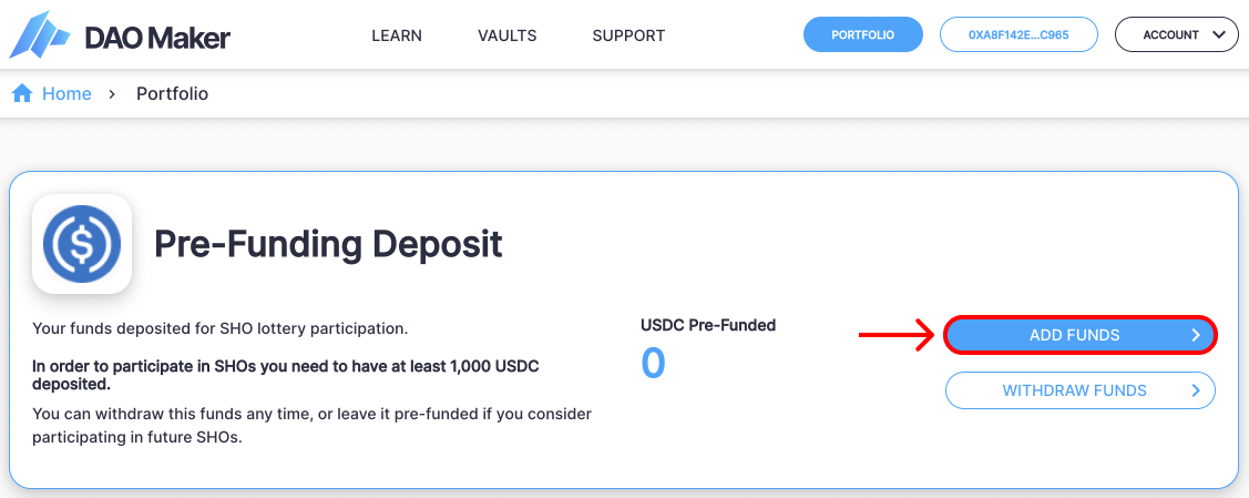 개인 할당 금액을 확인한 후 포트폴리오로 이동하여 Prefunding Deposit에 자금을 넣습니다. 작업이 완료되면 다음 단계를 진행합니다.