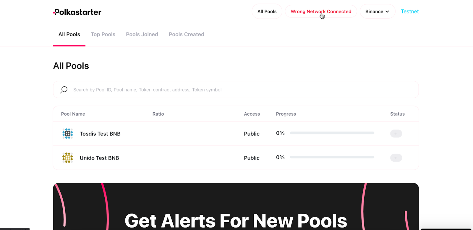 이제 폴카스타터 웹사이트가 바이낸스 스마트 체인 풀을 보여줄 것입니다! 혹시 지갑에 잘못된 네트워크를 선택했다는 메시지가 오면, 당신의 MetaMask를 BSC에 연결하고 위의 1단계와 2단계를 통해 폴카스타터와 다시 연결하세요.