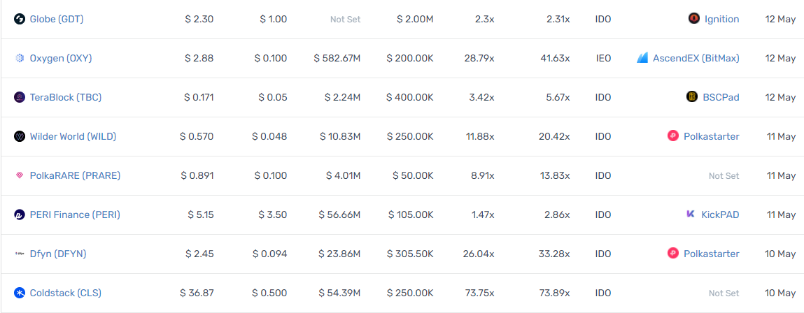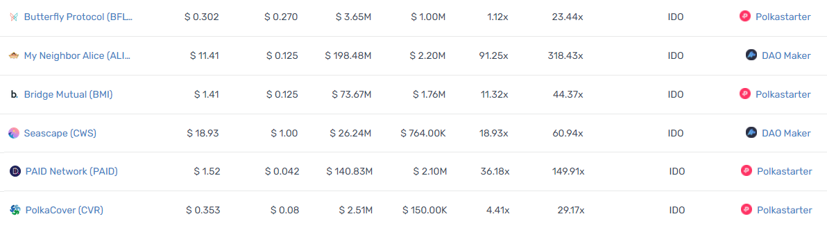 위 자료는 최근 다양한 플랫폼에서 IDO가 진행되었던 프로젝트들의 성적과 IDO의 초창기 프로젝트들의 성적입니다.