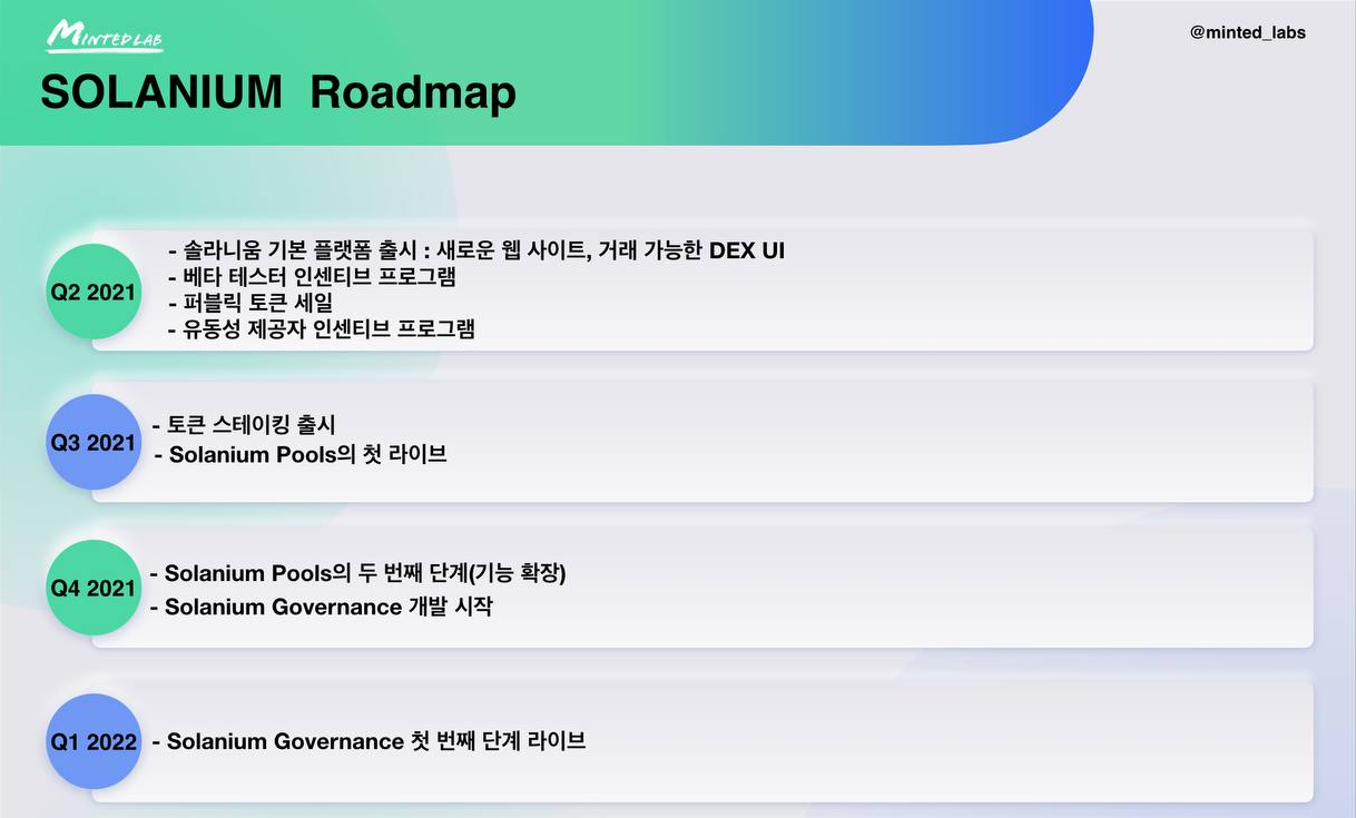 솔라니움의 로드맵과 투자자이니 참고하시기 바라며 현재 퍼블릭 토큰 세일을 진행하기 위한 화이트리스트 접수가 완료되었습니다.