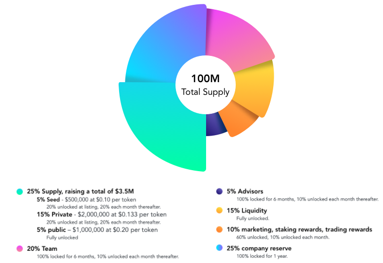 프라이빗 가격은 $ 0.133 - $0.183 USD, 퍼블릭 세일의 가격은 $0.2 USD로 세일이 각각 진행되었으며 퍼블릭 세일 가격을 기준으로 계산했을 때 초기 시가 총액은 $6,000,000 USD입니다.