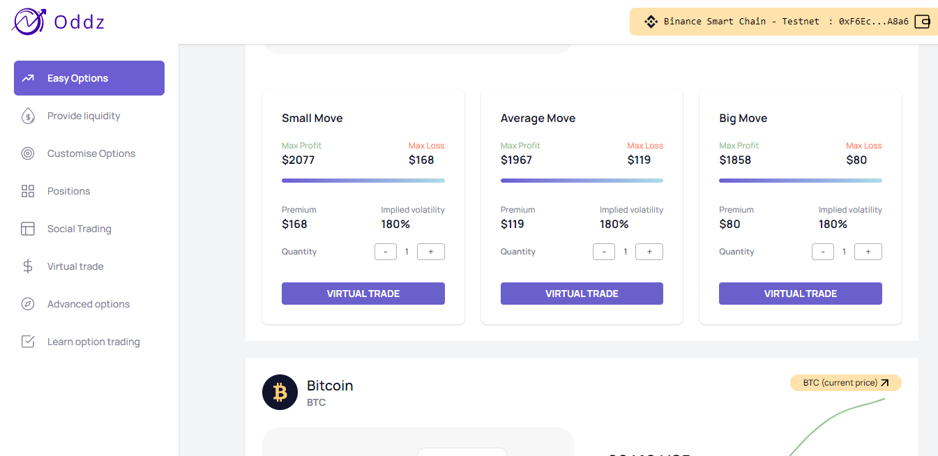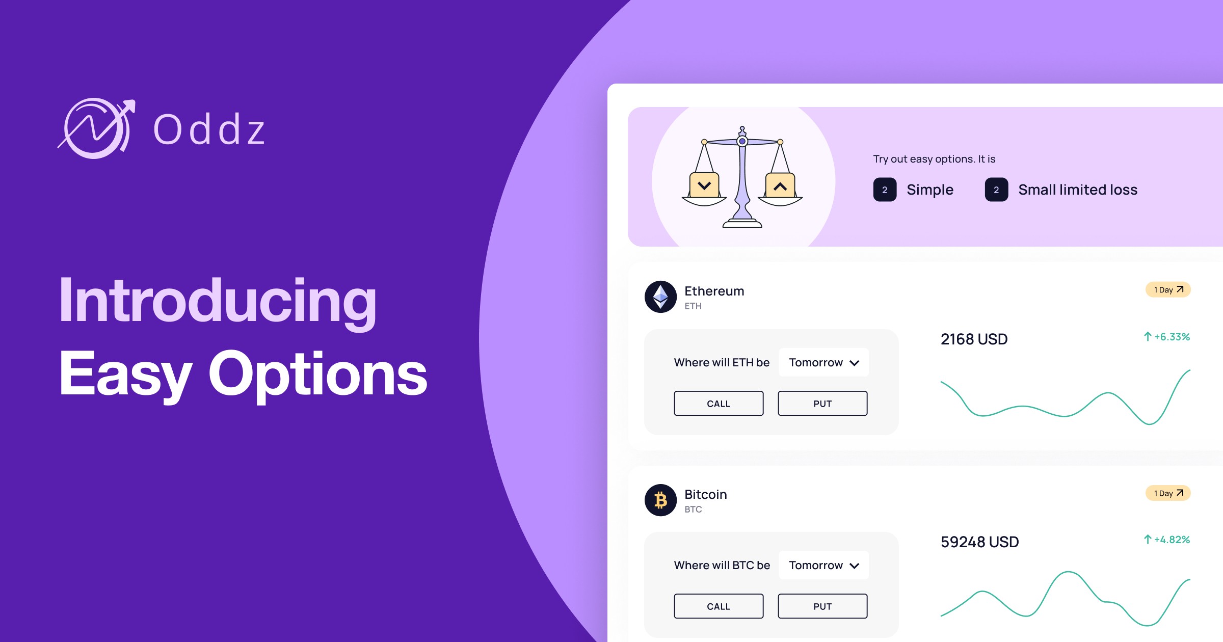 과거에 옵션 거래를 시도했지만 다양한 트레이딩 플랫폼의 복잡한 유저 인터페이스와 콜, 풋, 내재 변동성(IV), 델타, 감마, 베가, 테타, 로 등의 개념들로 인해 어려움을 느꼈다면, 앞으로는 그러지 않아도 됩니다! Oddz Finance는 고유의 ‘Easy Options’ 트레이딩 플랫폼을 가져와 사용자에게 간단한 유저 인터페이스를 제공합니다.