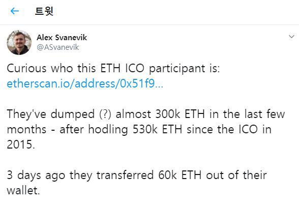 - 이더리움 초기 ICO고래 계정에서 3개월간 약 30만 이더리움이 판매되었다고 합니다.