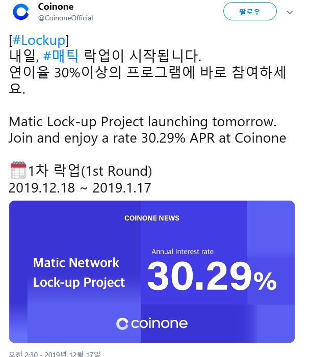 - 락업 코인은 "매틱"이며, 연이율 30.29%의 파격적인 이율이 적용된다고 하네요. 자세한 사항은 아직 공개되지 않았습니다.