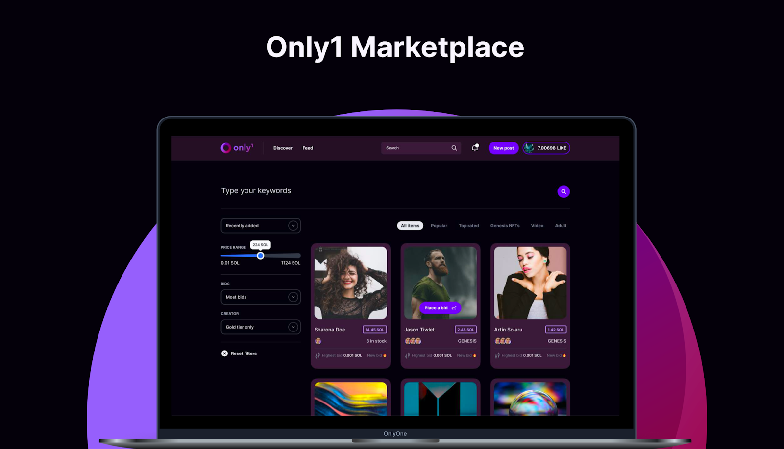 Only1은 솔라나 블록체인 위에 구축된 최초의 NFT 구동 소셜 플랫폼입니다. 소셜 미디어, NFT 마켓플레이스, 확장성 있는 블록체인, 그리고 네이티브 토큰인 $LIKE를 혼합해 Only1은 팬들이 그들이 좋아하는 크리에이터들과 연결할 수 있는 길을 열어줍니다. Only1 플랫폼을 이용해 팬들은 세계 유명 인플루언서/유명인 등이 만드는 NFT 구동 한정판 콘텐츠에 투자하고 액세스하며 수익을 창출할 수 있게 됩니다.