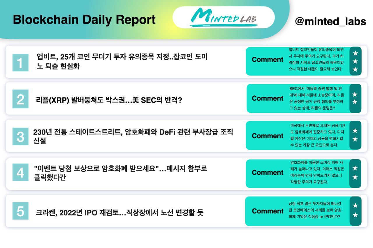 1. 업비트, 25개 코인 무더기 투자 유의종목 지정..잡코인 도미노 퇴출 현실화