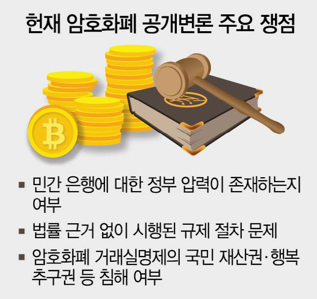 - 문재인 정부가 암호화폐 열풍을 잠재우겠다며 내놓은 고강도 규제를 놓고 헌법을 위배한 게 아닌지를 따지는 공개변론이 다음달 열린다.