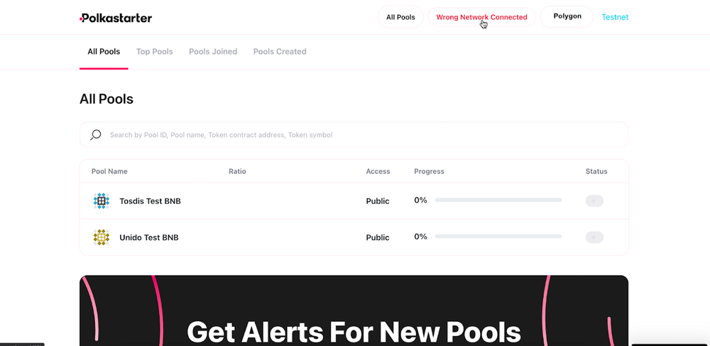 Polkastarter 사이트는 이제 Polygon Pools를 표시합니다! 지갑에 잘못된 네트워크를 선택했다는 메시지가 있는 경우 MetaMask를 Polygon에 연결하고 위의 1단계와 2단계에 따라 Polkastarter에 다시 연결하십시오.