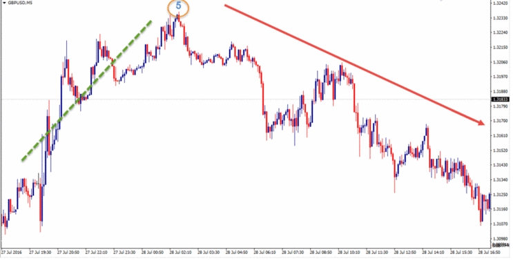 마지막 불태우는 불꽃 같은 구간으로 상승3파동이 만들어놓은 고점을 뚫을 경우 강력한 시세 분출이 되는 구간입니다. 하지만 반대로 뚫지 못하고 저항에 걸려 내려온다면 곧바로 매도를 때려야 하는 구간이기도 합니다. 상승 5파는 상당히 조심해야 하는 구간이기도 한데 이유는 바로 하락 A파동이 시작 되기 전 상승 마지막 파동이기 때문입니다. 하락 파동이 본격적으로 시작되는 만큼 속임수가 많이 나오게 됩니다.