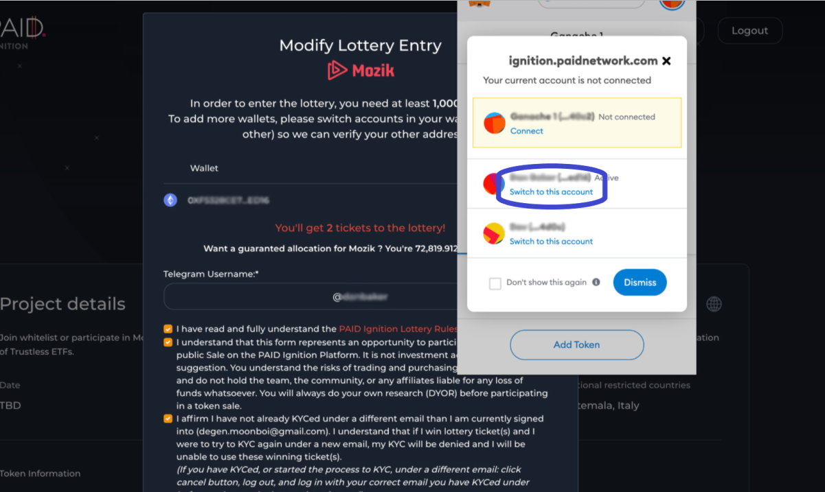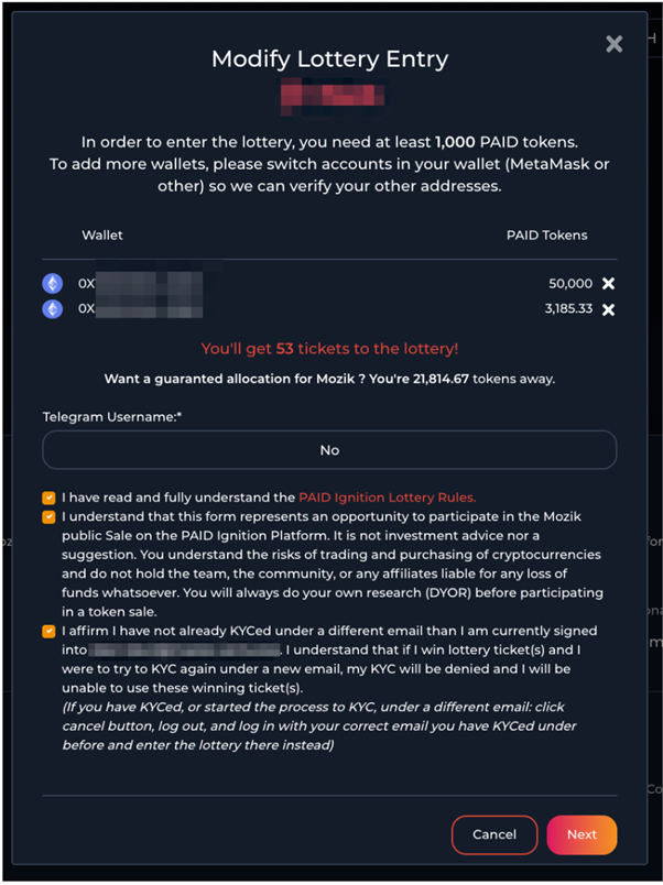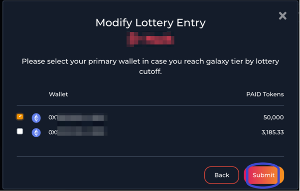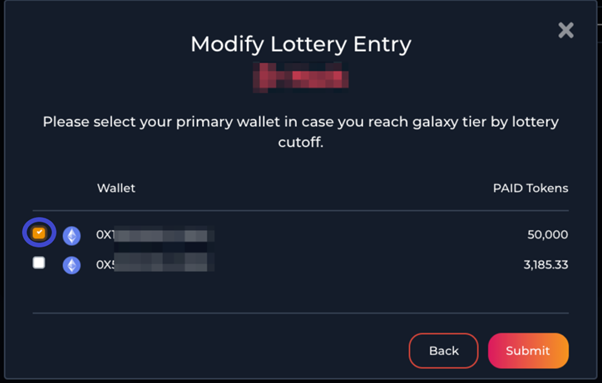 예를 들어, 다른 지갑 어드레스에 PAID 토큰을 추가로 구입하고 이 새로운 지갑을 추가하기 위해 당신의 항목을 수정할 수 있습니다. 이 작업은 화이트리스트 추첨이 종료되기 전에 수행되어야 합니다.