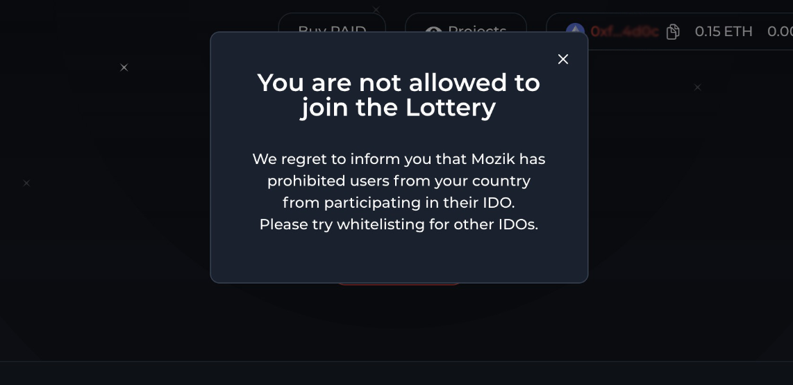 Ignition이 자동으로 당신의 국가 유저들이 해당 화이트리스트 추첨에 참여할 수 있는지 확인합니다. 만약 당신의 국가가 해당 IDO 참여가 금지되었다면, 다음 알림을 받게 됩니다: