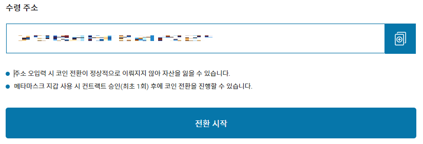 위 단계를 모두 완료하면 [ 수령 주소 ] 아래에 존재하는 [ 전환 시작 ] 버튼을 클릭할 수 있습니다.