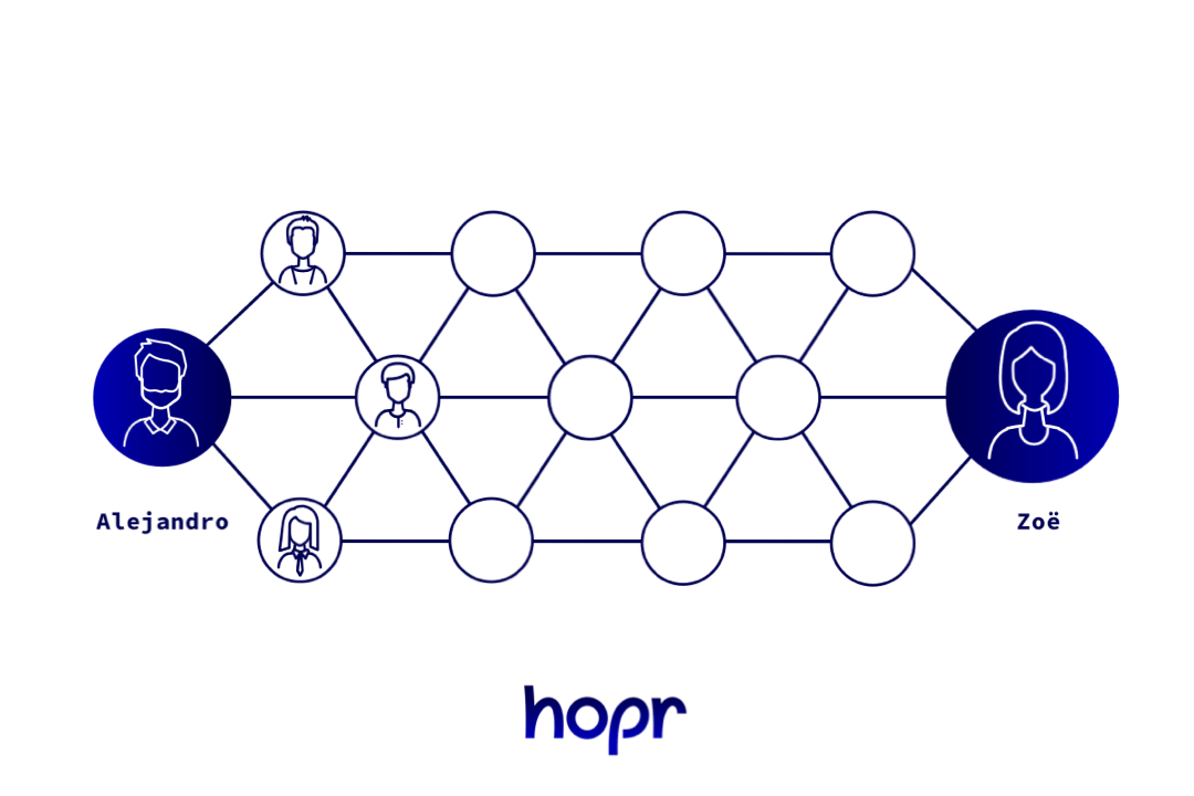 이렇게 메시지가 여러 수신지를 거쳐 전송되는 프로세스를 릴레이잉(relaying)이라고 부릅니다. 이는 HOPR에게 이름을 부여하는 것이기도 한데, HOPR에서 데이터는 목적지에 도달하기 전 한 사람으로부터 다른 사람에게 ‘hop(뛰다)’하기 때문입니다. 릴레이어의 전체 집합체를 네트워크라고 부르며, 네트워크의 각 포인트는 노드라고 부릅니다.