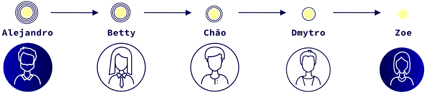 네트워크 활동을 추적할 수 있다면, 여기서 노드 사이의 패턴을 찾기 시작할 수 있습니다. 만약 Chāo가 Betty로부터 데이터 패킷을 받고 다른 패킷을 Dmytro에게 보낸다면, 당신은 그들 모두가 같은 체인의 일부라는 것을 추론할 수 있습니다. 이와 같은 추론을 충분히 만든다면 당신은 해당 네트워크의 프라이버시를 깨뜨릴 수 있습니다. 이는 어태커가 Betty, Chāo, Dmytro 중 하나(또는 셋 전부)라면 더욱 쉽습니다!