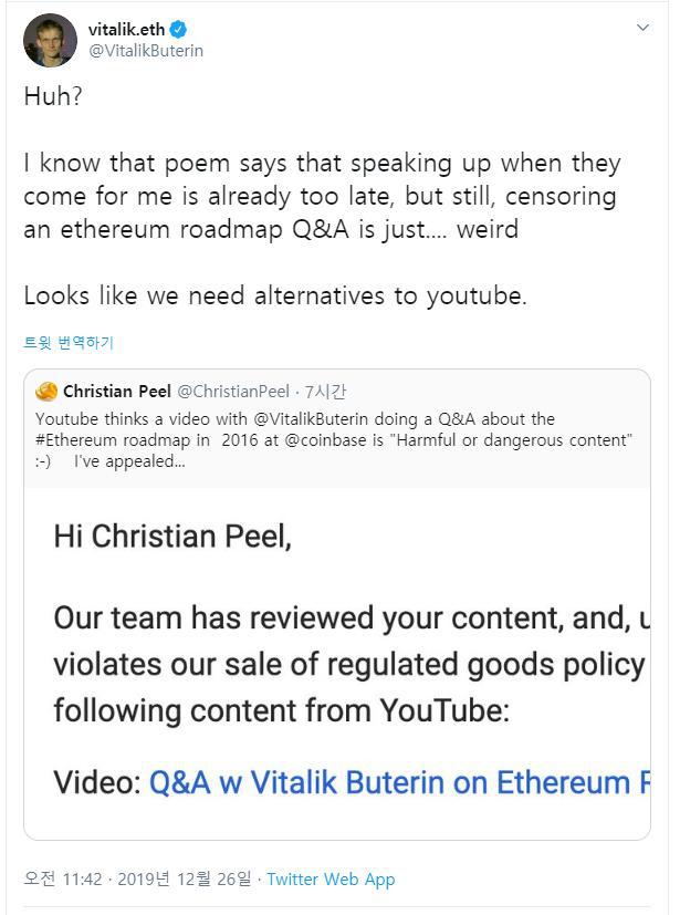 - 비탈릭 부테린의 경우, 2016년 이더리움 로드맵 관련 Q&A 세션을 수행하는 비디오도 위험 컨텐츠가 포함되어, 금지당했다고 합니다.