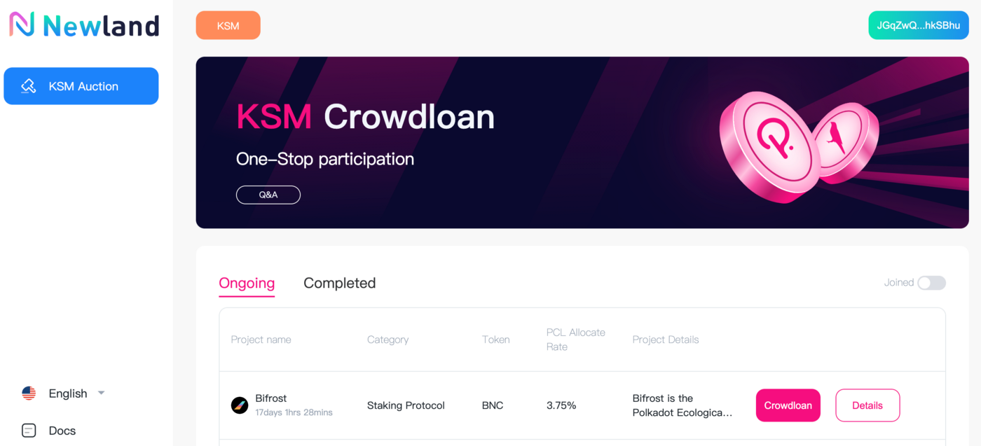 <Crowdloan>을 클릭해 크라우드론 페이지에 접속합니다. 페이지는 자동으로 지갑 앱에 연결해 지갑 어드레스를 가져옵니다