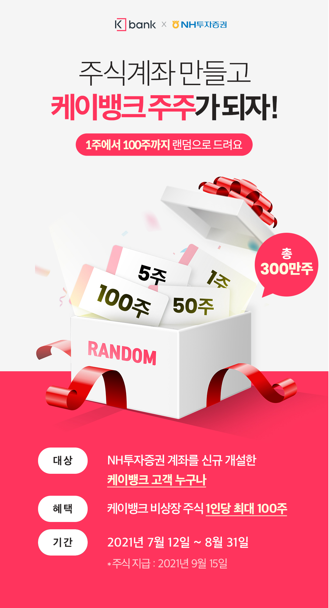 이번에 케이뱅크에서 이벤트를 통해 NH투자증권 계좌를 신규 개설한 케이뱅크 고객에게 케이뱅크 비상장 주식을 에어드랍합니다!
