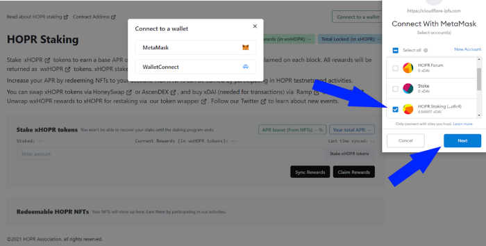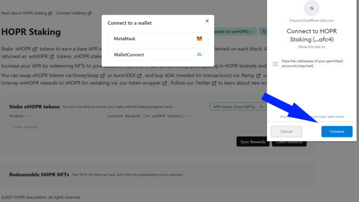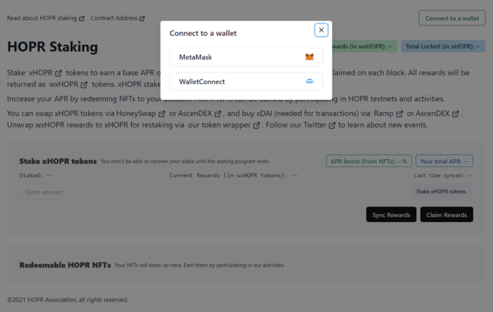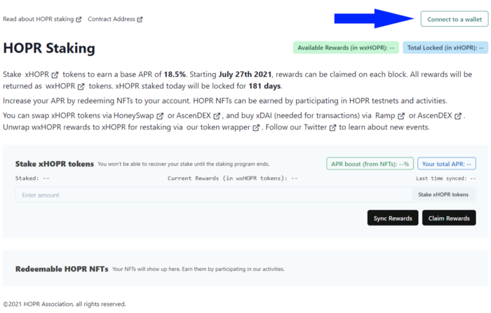 지갑에 스테이크 하고싶은 xHOPR를 획득하고 xDAI 체인에 당신의 지갑이 연결된 후, 당신은 HOPR 스테이킹 인터페이스에 연결하면 됩니다.