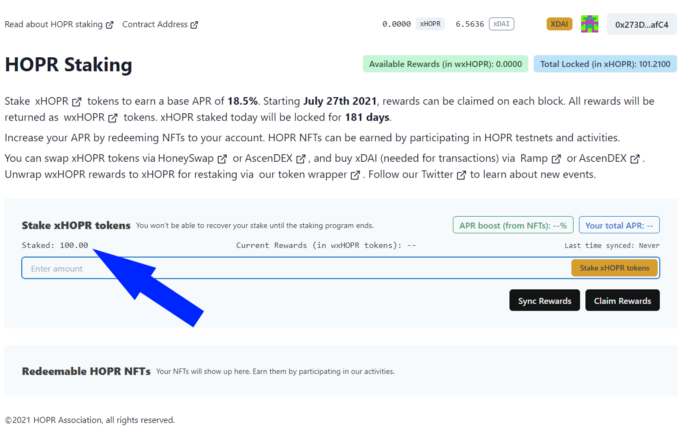 스크린 중앙의 금액 필드에 스테이크 하고싶은 금액을 입력하고 “Stake xHOPR Tokens” 버튼을 클릭합니다.