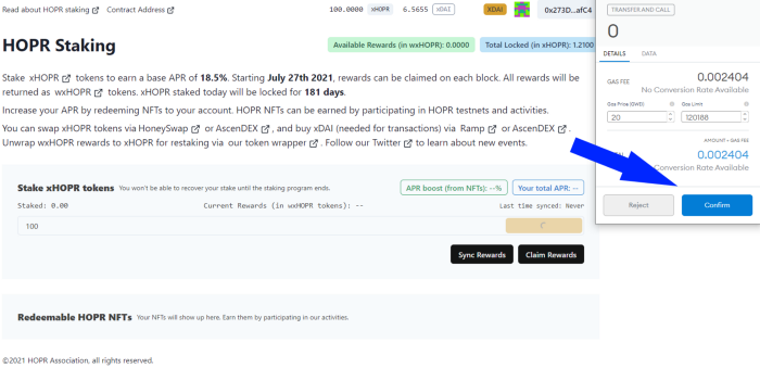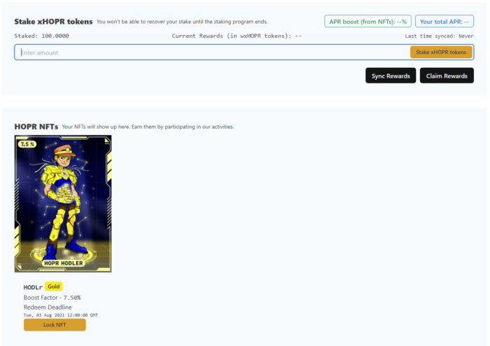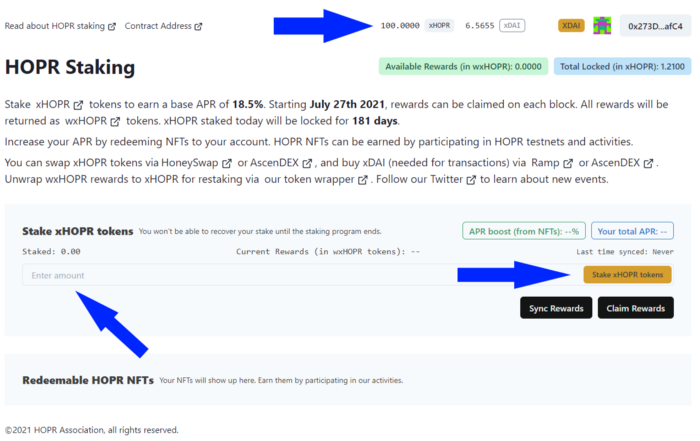 보상은 7월 27일 2pm CET경부터 축적되기 시작합니다. 보상은 언제든 청구할 수 있습니다. 청구할 수 있는 xHOPR의 양을 확인하려면 “Sync Rewards” 버튼을 클릭합니다. 청구하기 위해서는 “Claim Rewards” 버튼을 클릭합니다. 스테이킹과 마찬가지로 이 작업에도 소액의 수수료가 발생합니다.