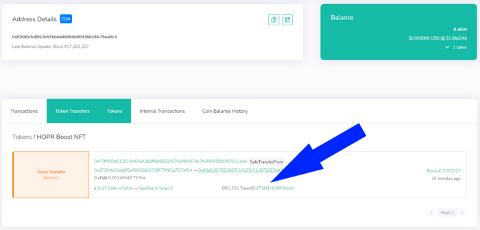아래의 예에서 볼 수 있듯이, 사용가능한 xHOPR 잔액은 이제 0이 되었으며, 스테이크된 잔액은 이제 100이 되었습니다.