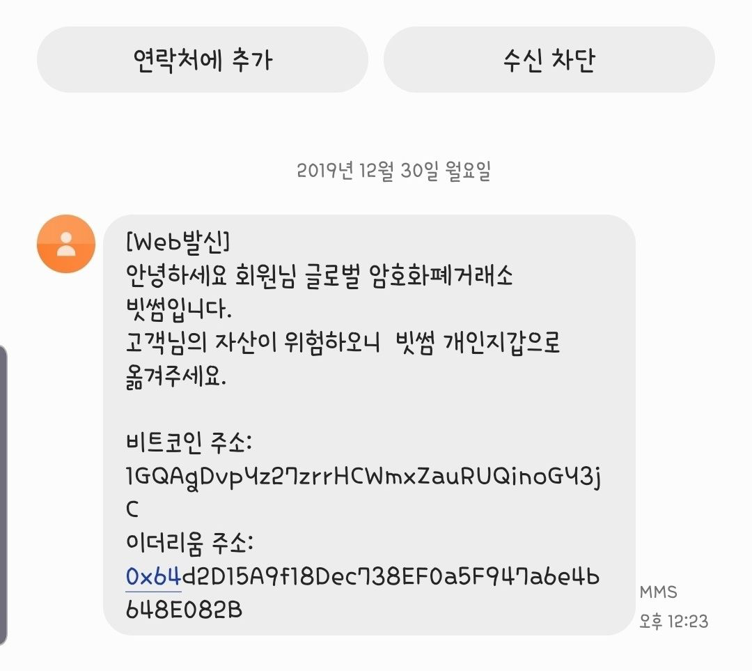 금일 한 회원의 휴대폰 번호로 위와 같은 스팸 메일이 날아왔습니다. 이와 함께 빗썸에서는 해당 문자 메시지는 빗썸 측에서 보낸 문자 메시지가 아니며 위와 같은 메시지를 받을 경우 조심해달라는 공지문을 올렸습니다. 다른 거래소 또한 위와 같은 메시지를 보내는 경우가 있는데 반드시 거래소를 통하여 전화로 확인 후 조치하시기 바랍니다.