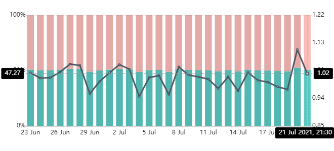 아래의 차트는 BTC 롱-숏 비율로, 시장 전반에 대한 관점을 제공합니다. 비율이 1을 유지하는 것은 롱 또는 숏 포지션을 유지하는 개인의 숫자가 같다는 뜻이며 즉, 시장 관점이 편향되지 않았다는 말입니다. 비율이 1보다 높으면 강세장을 의미하고 1보다 낮다면 시장 정서가 약세장에 있음을 의미합니다.