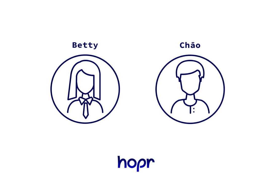 Betty와 Chao가 그들 노드 사이에 지불 채널을 열고 HOPR 토큰을 넣습니다.