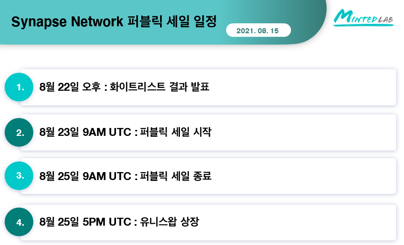 Synapse Network의 퍼블릭 세일 관련 일정은 아래와 같습니다.
