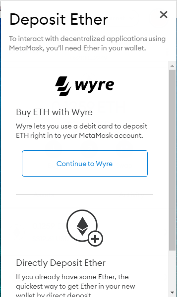 이렇게 하려는 경우, MetaMask 웹사이트로 이동해 간단한 설명에 따라 지갑을 셋업하십시오. 이 단계를 완료하면, 확장 프로그램을 열어 새로 생성된 이더리움 어드레스 메뉴에서 ‘구입’ 버튼을 선택합니다. 그 다음 당신은 Wyre로 이동하게 되며 여기서 직불카드를 이용해 이더리움을 구입할 수 있습니다.