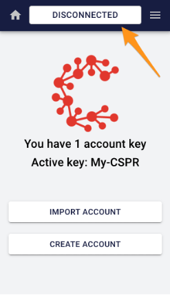 Signer 툴에서 활성화된 계정을 이용해 DISCONNECTED 버튼을 클릭해 연결상태를 전환하고 Casper 블록체인에 연결합니다.