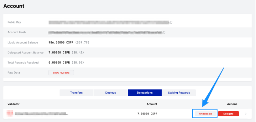 토큰 위임 해제 작업은 언제든 할 수 있습니다. 위임 해제 프로세스의 비용은 0.5 CSPR이라는 점을 알아두시기 바랍니다. 여러분은 위임 해제 기능을 세 가지 방법을 통해 이용할 수 있습니다.