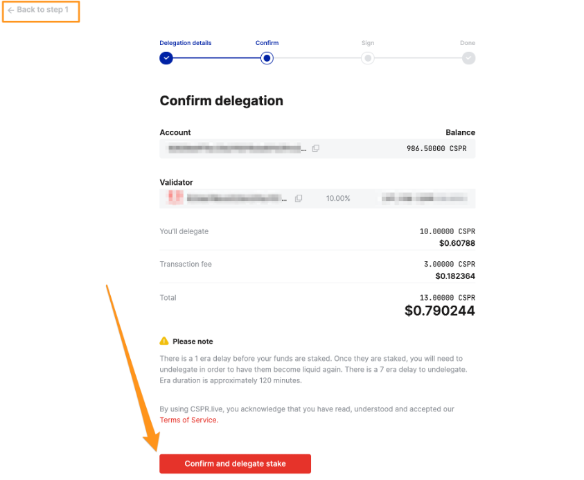 위임 프로세스에서 발생하는 수수료는 대략 3 CSPR이란 것을 알아두는 것이 중요합니다. 위임할 금액 외에도 계정에 여분의 CSPR이 있는것을 확인해야 합니다. 그렇지 않은 경우 트랜잭션이 실패합니다. 예를 들어 1000 CSPR을 위임하고 싶은 경우, 계정에 최소 1003 CSPR을 갖고 있어야 합니다.