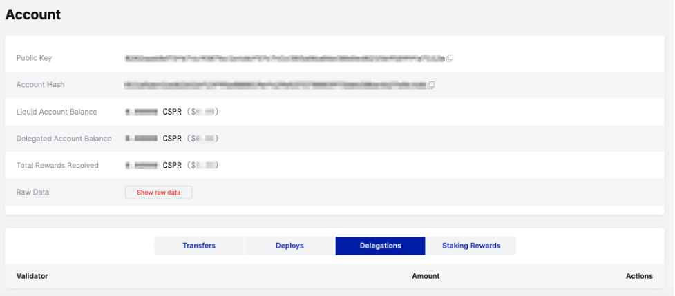 원하는 경우, Transfers, Deploys, Delegations, Staking Rewards 탭을 탐색할 수 있습니다.